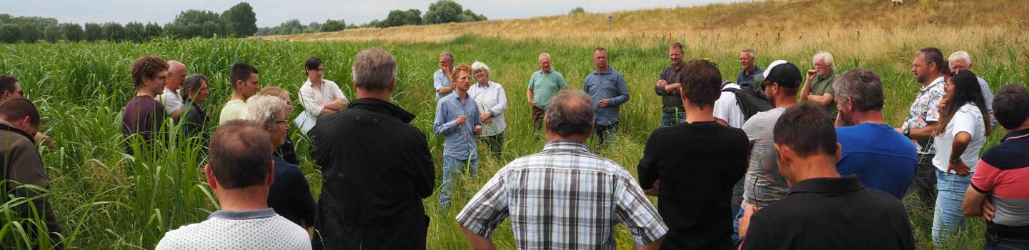 Na een heerlijke en uitgebreide lunch stapten de deelnemers in de auto voor een korte rit naar het miscanthus (olifantsgras) perceel van de familie. Eenmaal gearriveerd vertelde Gijs Smits van Oyen over de aanplant van het gewas en de ervaringen die men heeft ongedaan. Vervolgens vertelde Filip Baecke, expert op het gebied van miscanthus over de “ins en outs” van dit bijzondere gewas. Filip heeft vanuit zijn bedrijf cradle crops al 11 jaar ervaring met de teelt en afzet van miscanthus en heeft in het verleden veel nieuwe telers op weg geholpen. Er werden veel vragen gesteld met name over de teelt, opslag en het hakselen van het gewas. De volgende spreker was Monique Bestman van het Louis Bolk Instituut. Monique heeft 9 jaar geleden een project gedaan met miscanthus in kippenuitlopen. De pilot waar ze nu mee bezig is gaat over natuurwaarde van het gewas in natuurgebieden en daar vertelde ze enthousiast meer over.