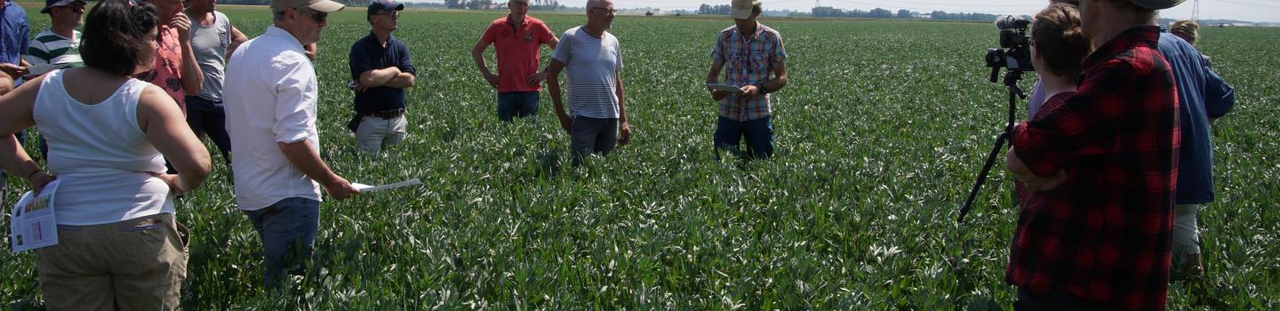 Jan Rombouts laat de deelnemers aan de studiedag zijn mengteelt van veldbonen en tarwe zien. De BD-teler heeft een beperkte stikstofruimte en kan dus een gewas dat veel eiwit produceert zonder bemesting goed gebruiken. Hij voert de tarwe en bonen aan zijn kippen. Rombouts: „De tarwe pakt alle stikstof uit de schrale grond en de veldboon maakt met zijn wortelknolletjes zijn eigen stikstof. Het ras Tiffany is laag in bitterstof.”
