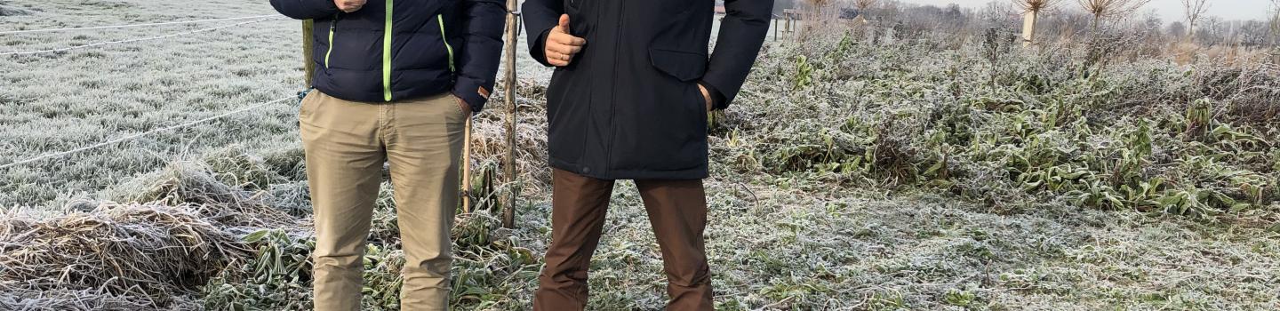 Reinier (links) vertelt Michaël over de inrichting van zijn land en hoe hij op zijn eigen erf koolstof boert.